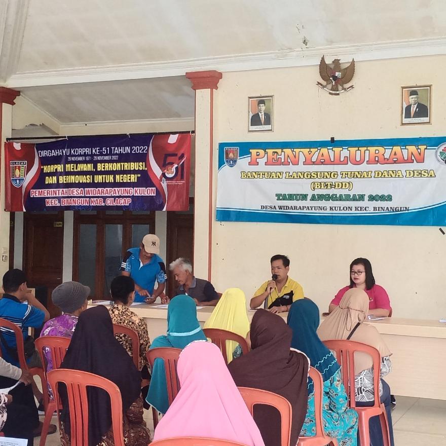 Jum'at, 9 Desember 2022 bertempat di Balai Desa Widarapayung Kulon dilaksanakan Penyaluran BLT Dana Desa untuk tahap ke-12 yaitu bulan Desember Tahun 2022, ini merupakan penyaluran BLT DD yang terakhir yang diberikan Pemerintah Desa Widarapayung Kulon kepada Keluarga Penerima Manfaat.