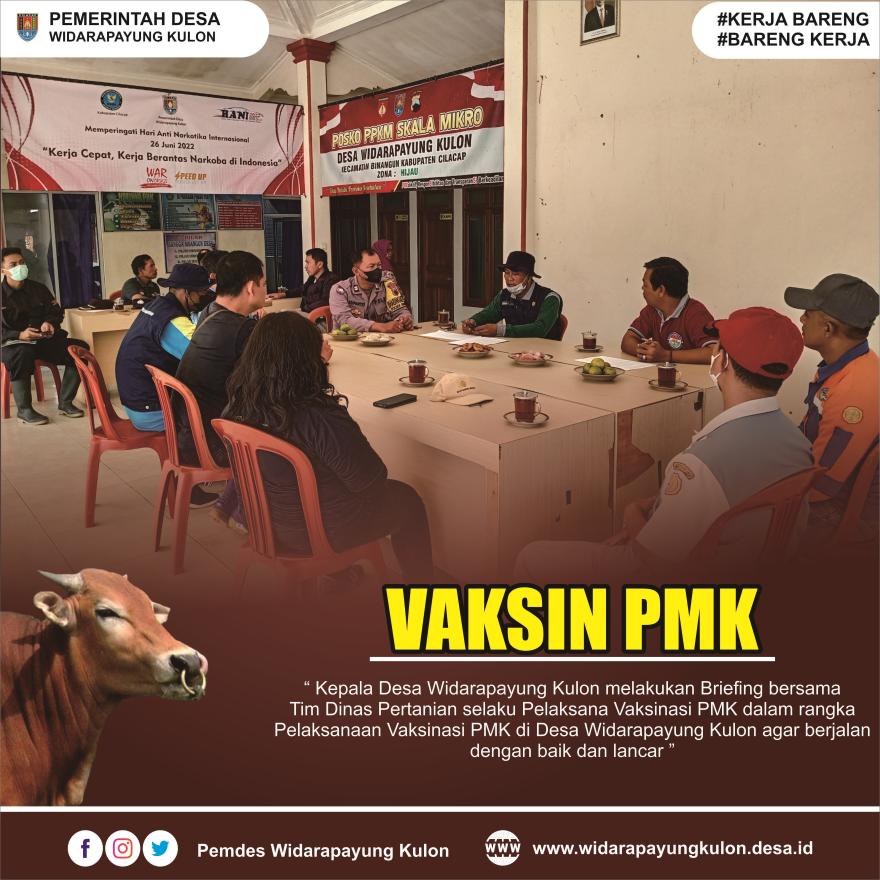 Untuk mencegah penularan Penyakit Mulut dan Kuku  (PMK) yang menyerang hewan ternak sapi, Hari ini, Sabtu, 2 Juli 2022, di laksanakan kegiatan Vaksinasi PMK Tahap Pertama di Desa Widarapayung Kulon sejumlah 160 Dosis dari Jumlah Data Peternak Sapi Di Desa Widarapayung Kulon sekitar 196 Peternak dan 607 ekor Sapi